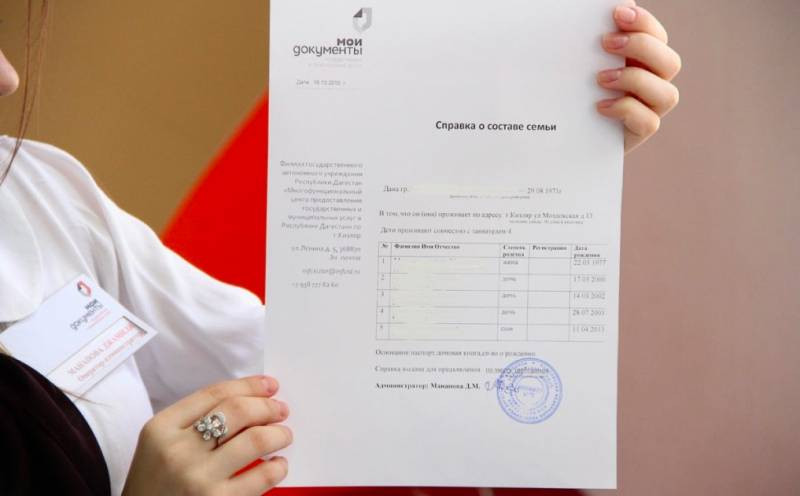 Одно окно. Специальные центры, распространённые по всей стране, через которые можно получить справки и выписки из различных государственных служб и учреждений. Справка о составе семьи не исключение. Приходим на приём с паспортом, ждём некоторое время, необходимое для запроса, получаем нужную бумагу. Всё бесплатно, быстро и удобно.