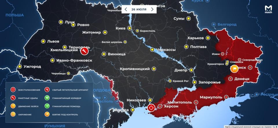 Карта боевых действий на Украине от 26 июля 2022. Актуальные данные о военной спецоперации