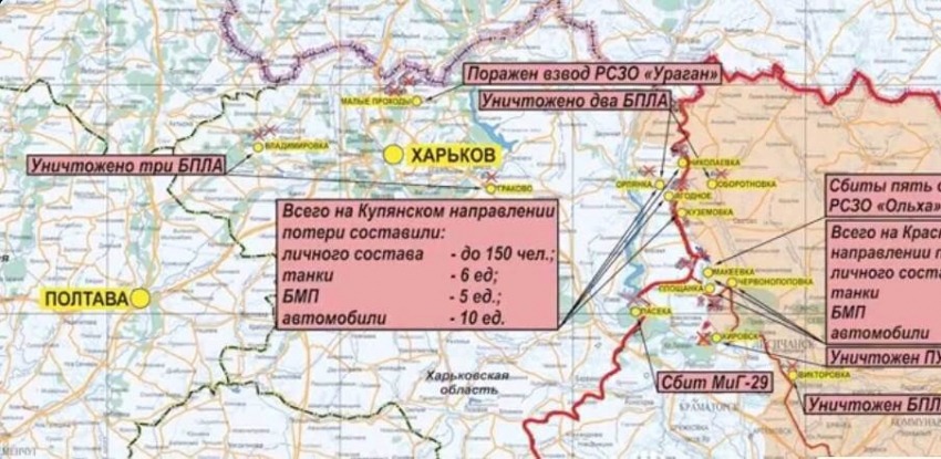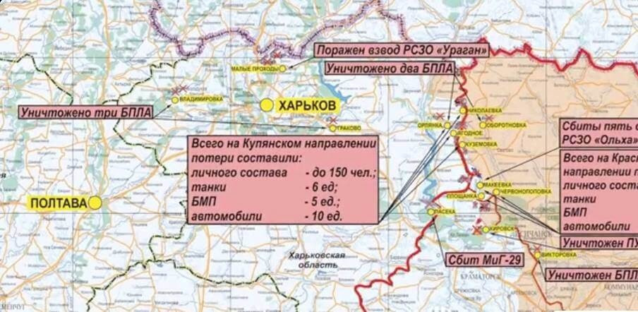 На Купянском направлении противник силами двух батальонов, усиленных иностранными наемниками, предпринял попытку атаковать в направлении населенных пунктов Ягодное, Николаевка, Орлянка Харьковской области и Куземовка Луганской Народной Республики. В результате огневого поражения и активных действий подразделений российских войск противник отброшен на исходные позиции. Уничтожено до 150-ти украинских военнослужащих и наёмников, шесть танков, пять боевых машин пехоты и 10 автомобилей.